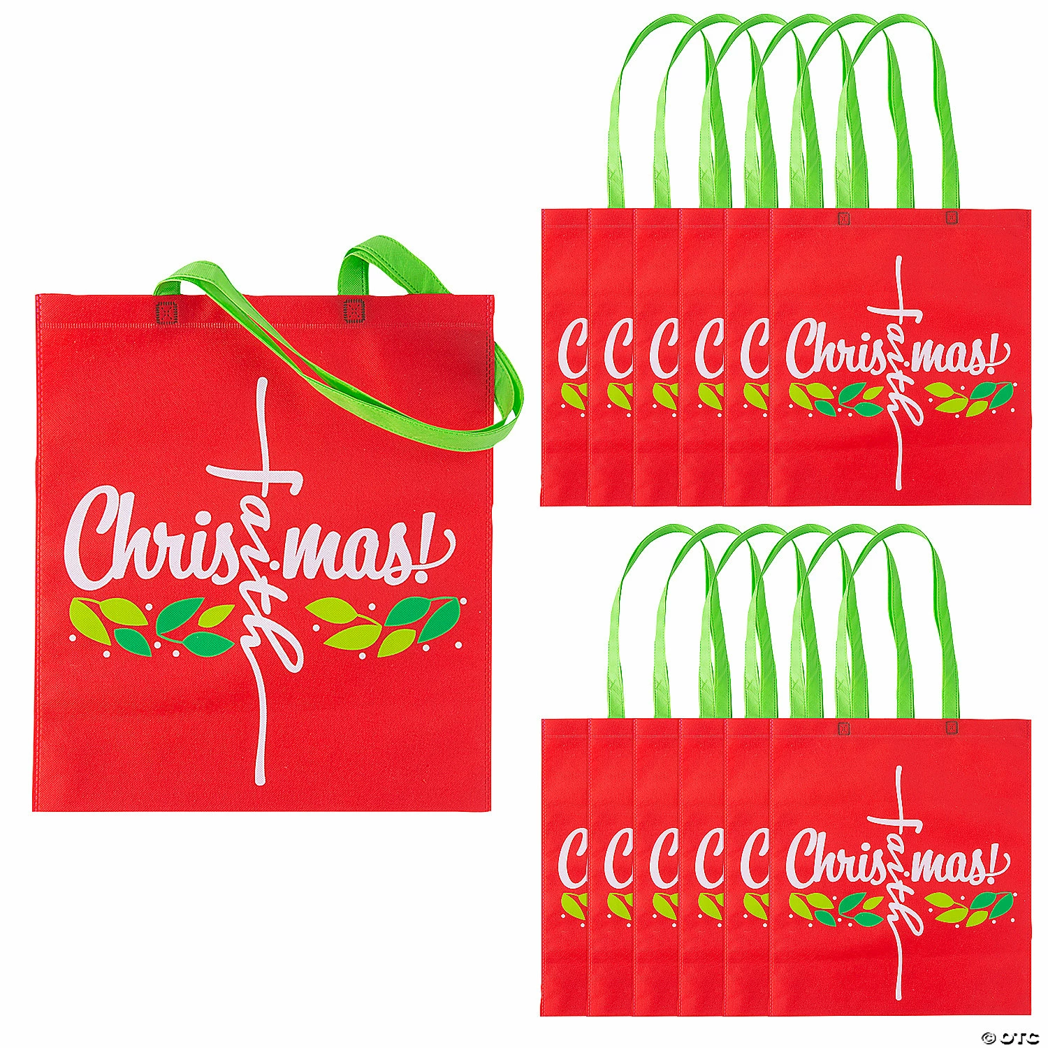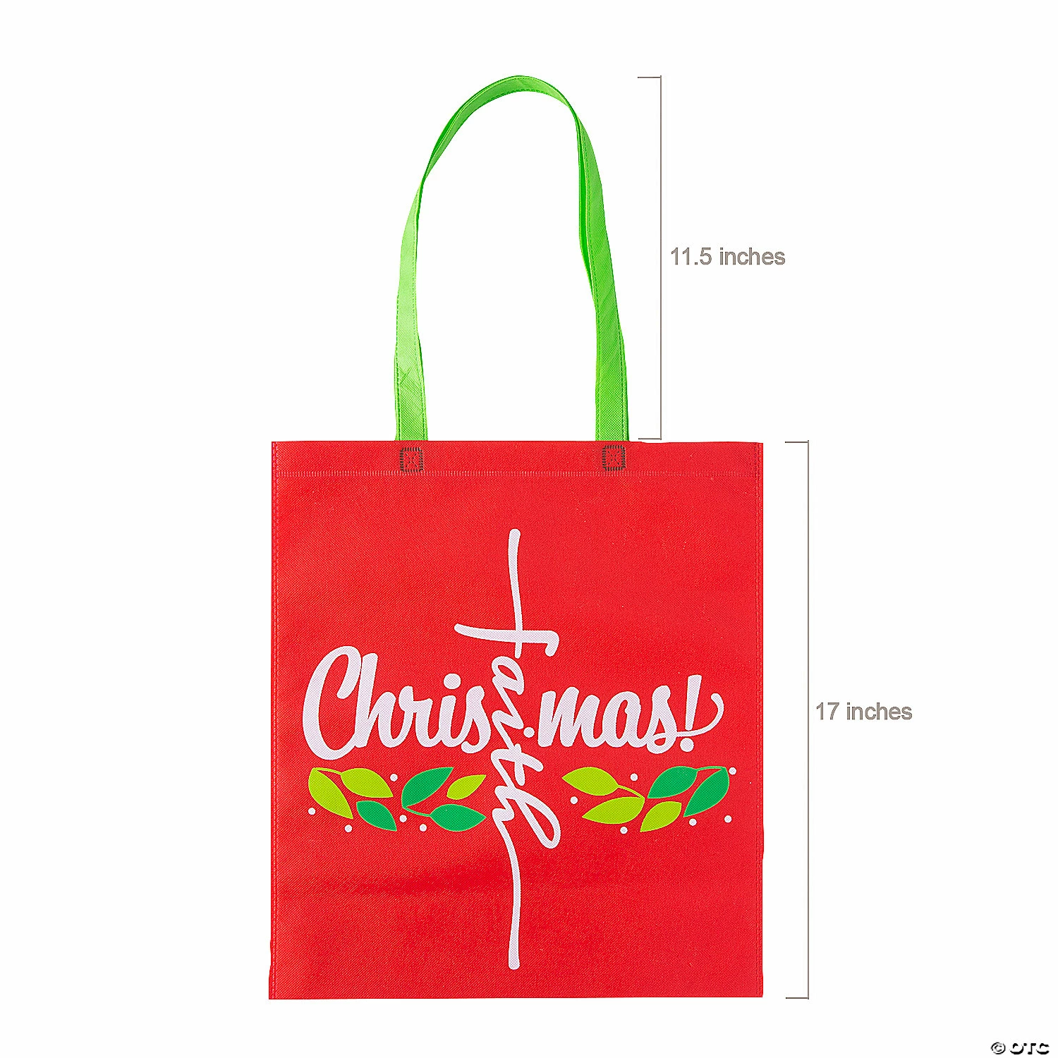 • Durable Quality: Made of cloth, this sturdy tote bag won’t let you or your accessories down. Plus, you can easily store the reusable bag away until you need it again. • Eco-Friendly: Ditch the plastic bags and go green with this eco-friendly tote bag! Mother Earth is sure to appreciate the gesture, so go ahead and gift this tote bag to your friends and family while you’re at it! • Travel-Friendly: No matter where your day takes you, this tote bag is sure to be a handy companion! Designed with easy-to-use straps and a spacious interior compartment, this tote bag is ready for on-the-go fun! Product Description:This Christmas, remind your loved ones about the true meaning of the season with some faith-themed totes. These bags are perfect holiday handouts to give at a church small group or Christmas party. Featuring a festive design and spacious interior, these bags are the perfect item for carrying gifts while shopping and holiday traveling. © OTCSize: 15″ x 17″ with 11 1/2″ handlesQuantity: 12Material: Nonwoven polypropylene