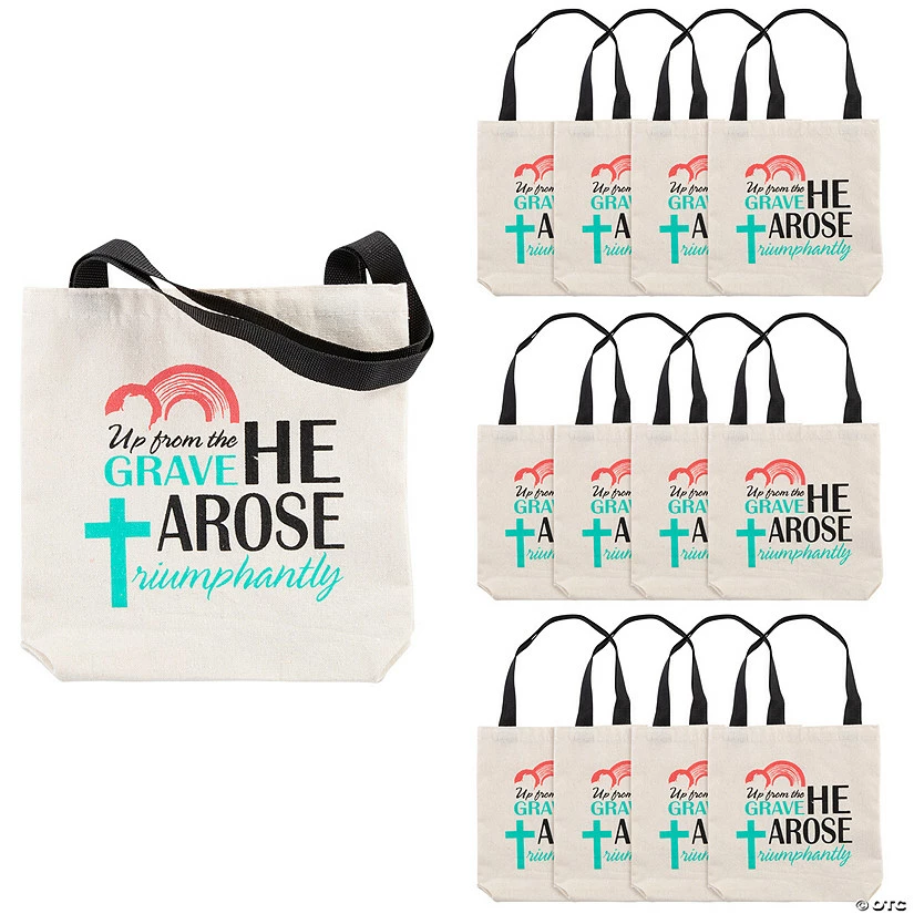 • Travel-Friendly: No matter where your day takes you, this religious tote bag is sure to be a handy companion! Designed with easy-to-use straps and a spacious interior compartment, this tote bag is ready for on-the-go fun and a great way to carry a sign of your faith.• Durable Quality: Made of cloth, this sturdy tote bag won’t let you or your accessories down. Plus, you can easily store the reusable bag away until you need it again.• Multi-purpose: This tote bag can carry a wide range of everyday essentials, including your Bible, VBS or Sunday School supplies, snacks, sunglasses and more!Product Description:Featuring the text, “From the Grave He Arose Triumphantly”, this lovely and convenient canvas tote bag serves as a reminder that you may carry your faith with you wherever you go. These bags make lovely party favors at church functions and raffles, and VBS students love them to use as a way to carry their study materials to and from the classroom. Hand them out to your Sunday School students as a special and functional treat. Size: 8″ x 8″ Quantity: 12Material: Cotton and polyester.© OTC