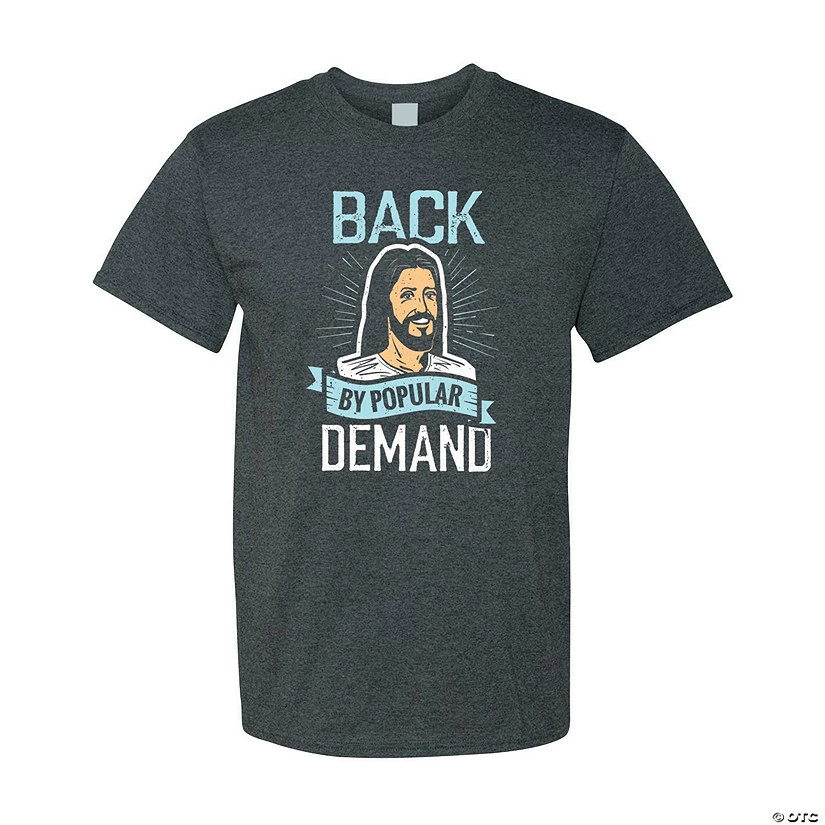 Jesus: back by popular demand! This funny graphic tee for adults is perfect for wearing throughout the Easter season. Whether you’re wearing it to Easter service or you just want to sport it throughout your Easter Sunday, this comfy t-shirt has you covered. Makes a fun Easter gift or Easter basket stuffer, too. © OTC• Brand: Fruit of the Loom• Short sleeve• High-density fabric• 50% cotton and 50% polyester.• Tear away label• Double needle hemmed sleeves and bottom• Need more? With our tees, we’ve got your back (and front)! To order in bulk for any size group, just call 1-877-513-0384. Or, give us a ring if you’d like to easily customize any of our pre-printed shirts with our free design service.
