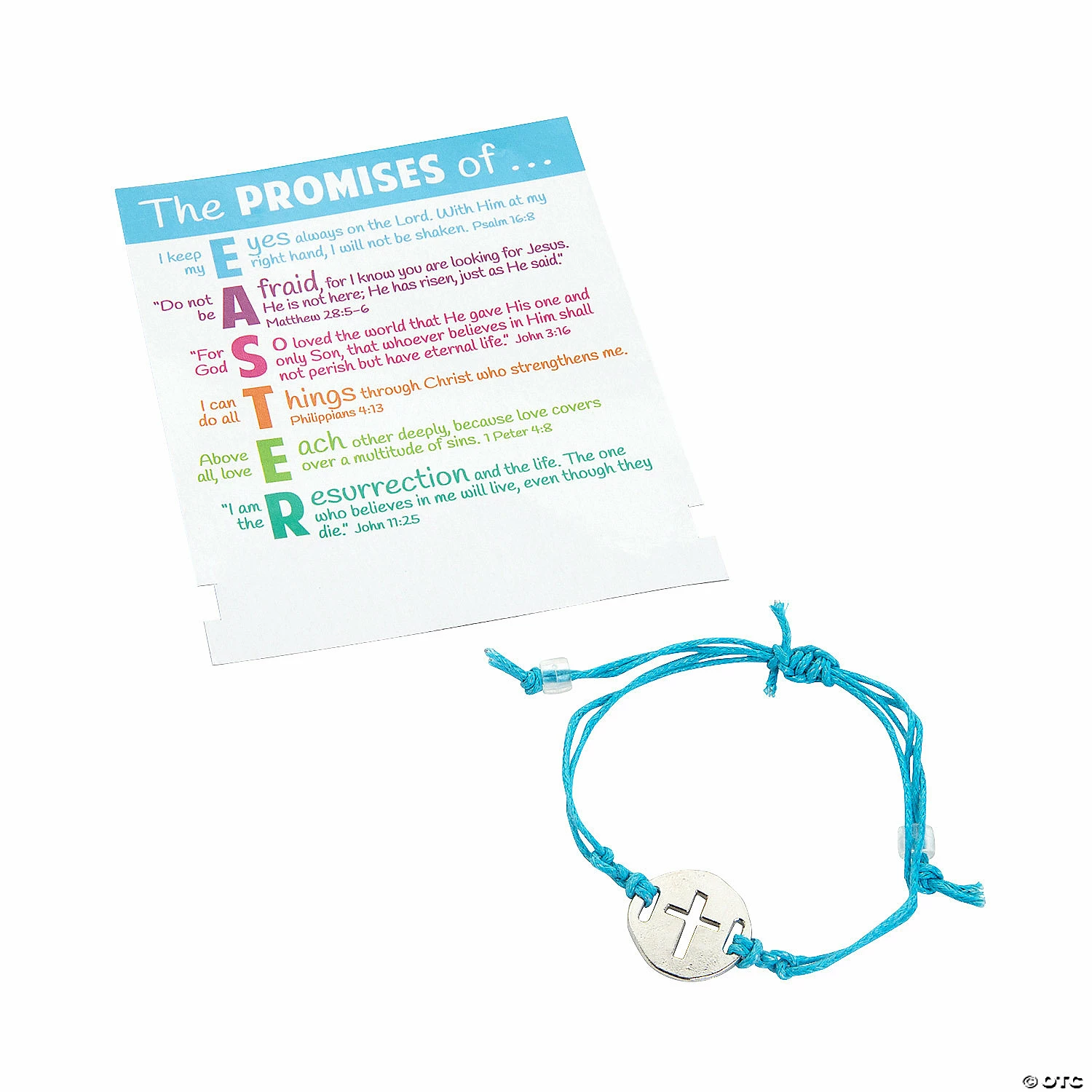 Share the promises of Easter with this faithful handout! Featuring multiple Bible verses on a brightly colored card and a beautiful bracelet with cross charm, believers will love this Easter gift as an Easter basket filler or Easter egg hunt prize. Polyester. Adjustable up to 10 1/2″ circ. with a 3/4″ metal charm. © OTC
