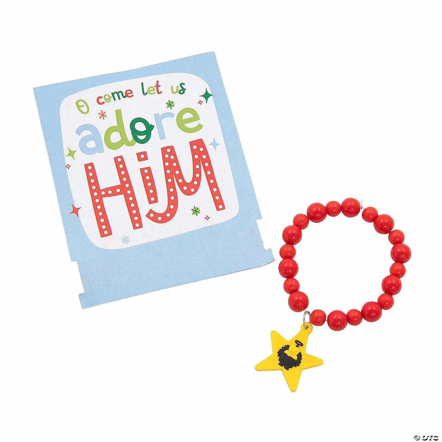 Sunday School kids will love these colorful beaded bracelets featuring a star-shaped charm with an image of Baby Jesus in the manger. The cardstock card has a message of “O come let us adore Him” and fits a bracelet perfectly, making this a fantastic set to hand out to Sunday School students as Christmas gifts or as kids’ party favors at a holiday party. Plastic. 7″ circ. with 1 1/4″ charm with 3 3/4″ x 4 1/2″ cardstock card. © OTC