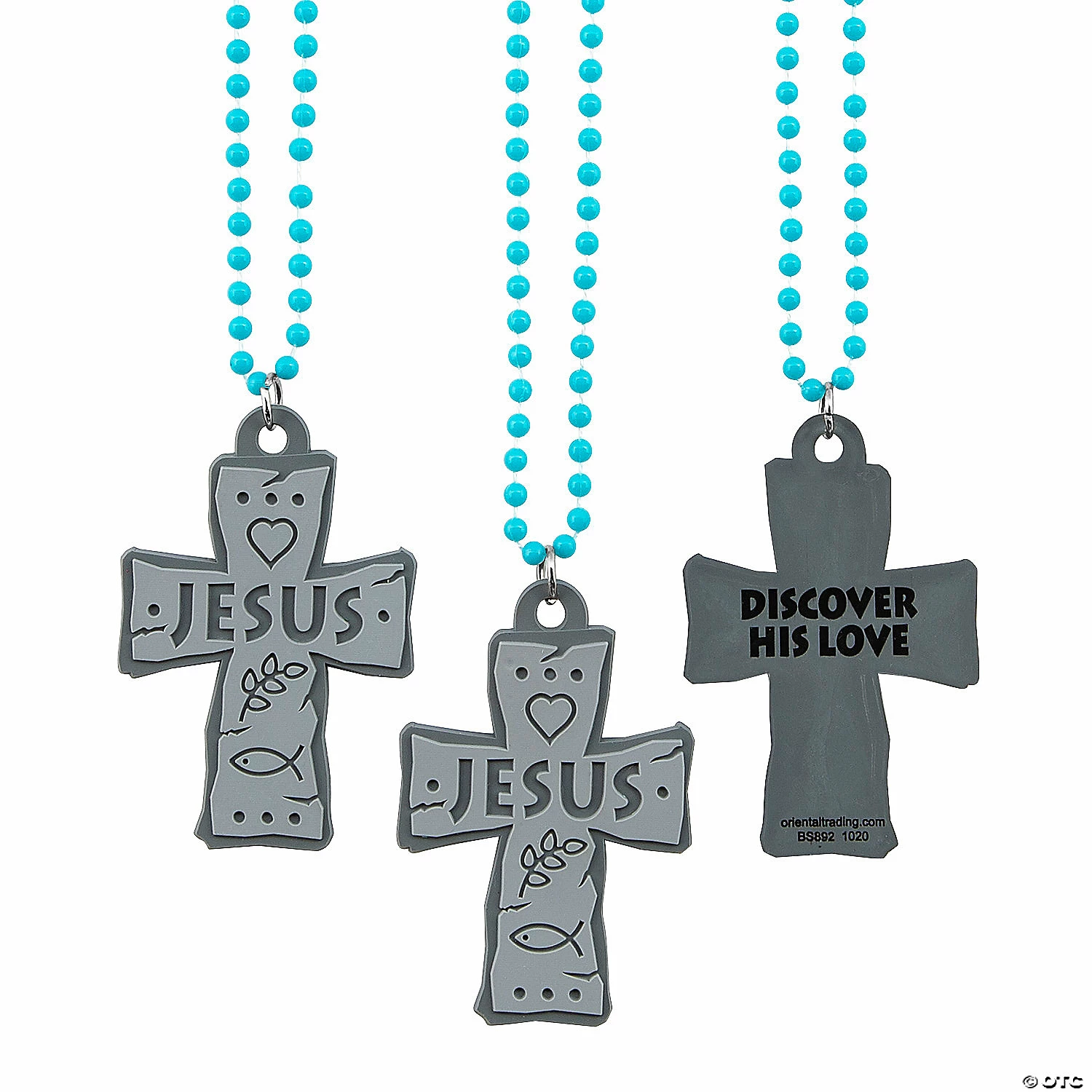 Add these cute necklaces to your Dig VBS supplies list to hand out as Dig VBS giveaways or prizes. Each necklace has a cross-shaped charm with a stone look and featuring the name “Jesus” along with faith images on a beaded necklace. These necklaces make great Dig VBS prizes and giveaways and kids will be excited to earn their own necklaces. Plastic. 2 1/2″ charm on a 24″ breakaway beaded necklace with 4mm beads. © OTC