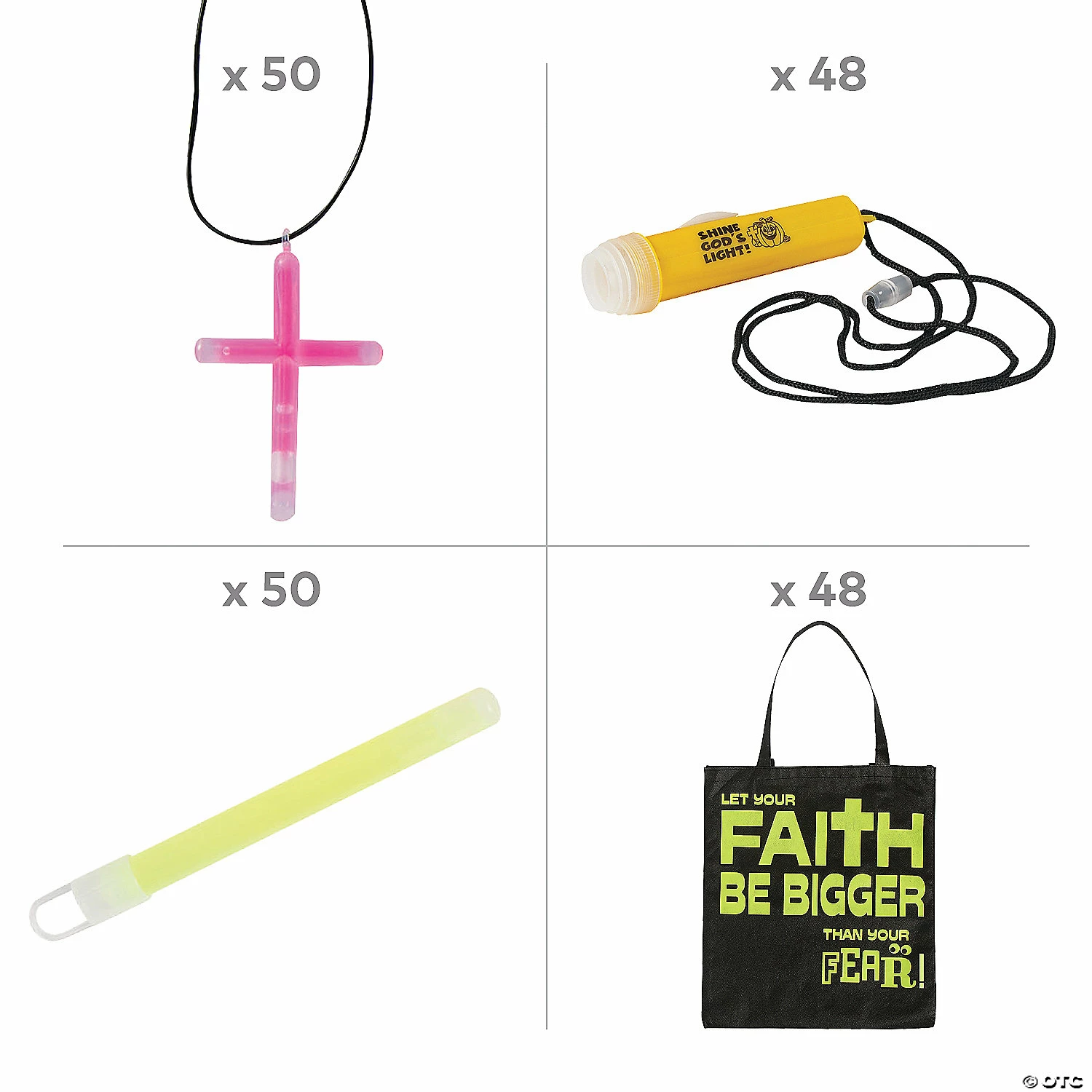 Take the scary right out of Halloween with these faith-filled accessories! Each glow-in-the-dark accessory is perfect to hand out at a church Harvest Festival or Halloween Safe Night. Trick-or-treaters will love these glowing pieces and will have an easier time remembering to honor only one ghost on Halloween: the Holy Ghost! (196 pcs. per unit) Simple assembly required. Assortment may vary.Includes:• 50 Glow Sticks (4″ Snap and shake to activate the glow.)• 48 Plastic Christian Pumpkin Flashlights on a Rope (3 1/2″ flashlight is on a 36″ nylon cord. Requires 1 “AA” battery, not included.)• 48 Nonwoven Polypropylene Large Glow-in-the-Dark Faith Over Fear Tote Bags (15″ x 17″ with 11″ handles.)• 50 Plastic Glow Stick Cross Necklaces (2″ cross on a 15″ plastic cord. Snap and shake to activate the glow.)