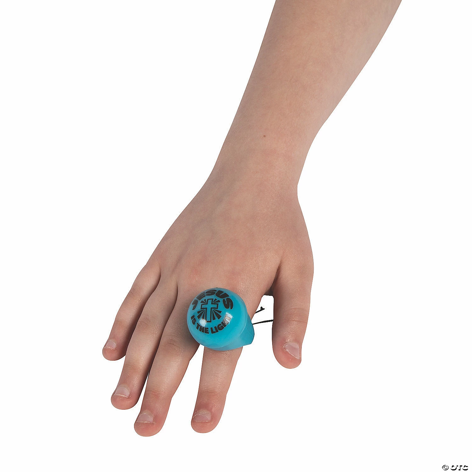 Share His light! A great religious favor for Sunday Schools, party favor bags and even stocking stuffers, simply press into the middle of the ring to activate the flashing light! Push it again to get it to shut off. Each ring is attached to an elastic band with a card that is printed with the verse from John 8:12. Includes 12 rings and 12 cards. Silicone. Ring, 1 3/4″; card, 2 1/2″ x 3/4″. Includes batteries. © OTC