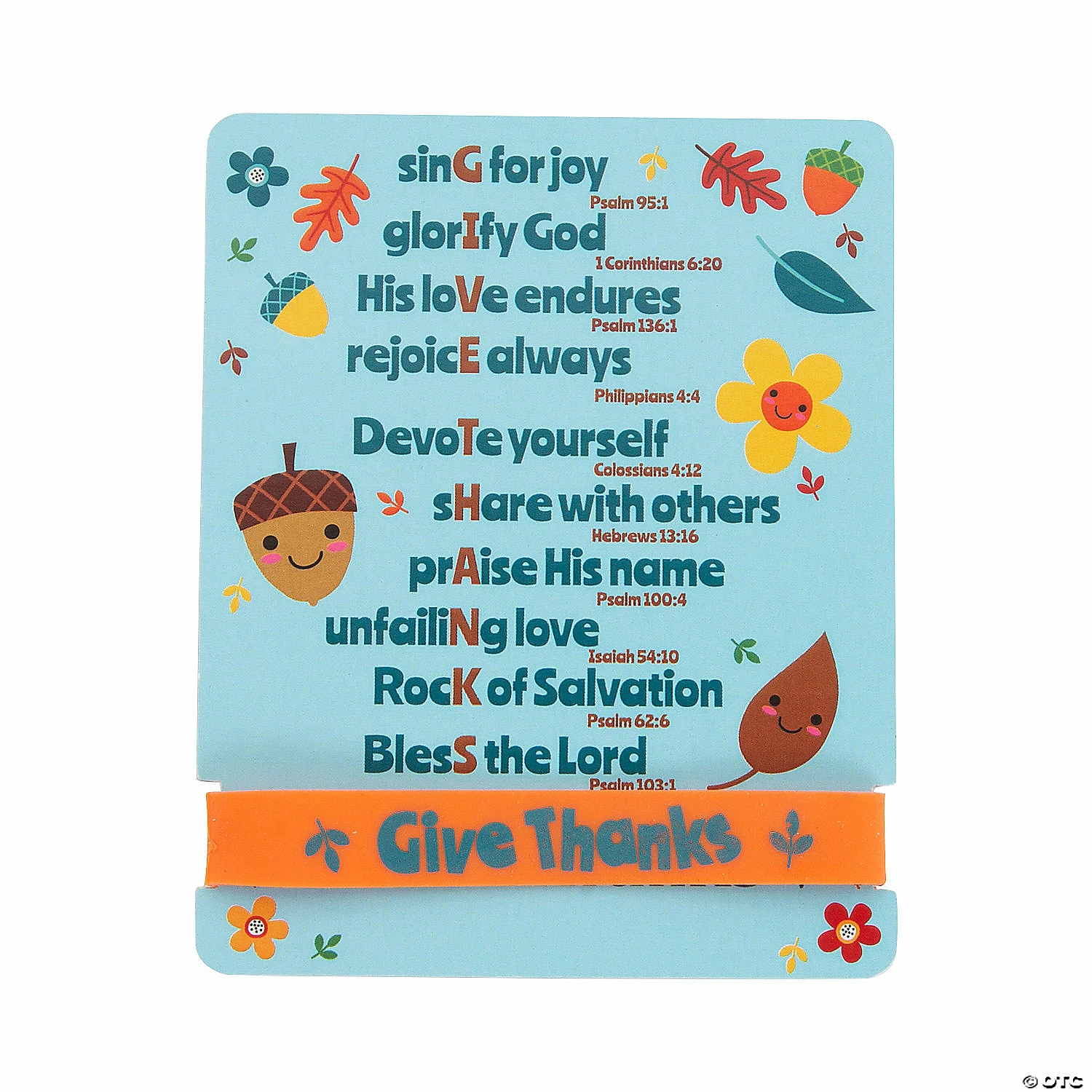 These cute rubber bracelets feature a fall color and the message “Give Thanks”. Distribute these bracelets attached to the accompanying cards that are especially designed to go with these bracelets. Great as Sunday School giveaways during the Thanksgiving season, this bracelet and card duo helps kids to remember to give thanks in all things. Rubber. (2 dozen per unit) 7 1/4″ circ. with 3 3/4″ x 4 1/2″ cardstock card featuring To/From space. Simple assembly required. © OTC