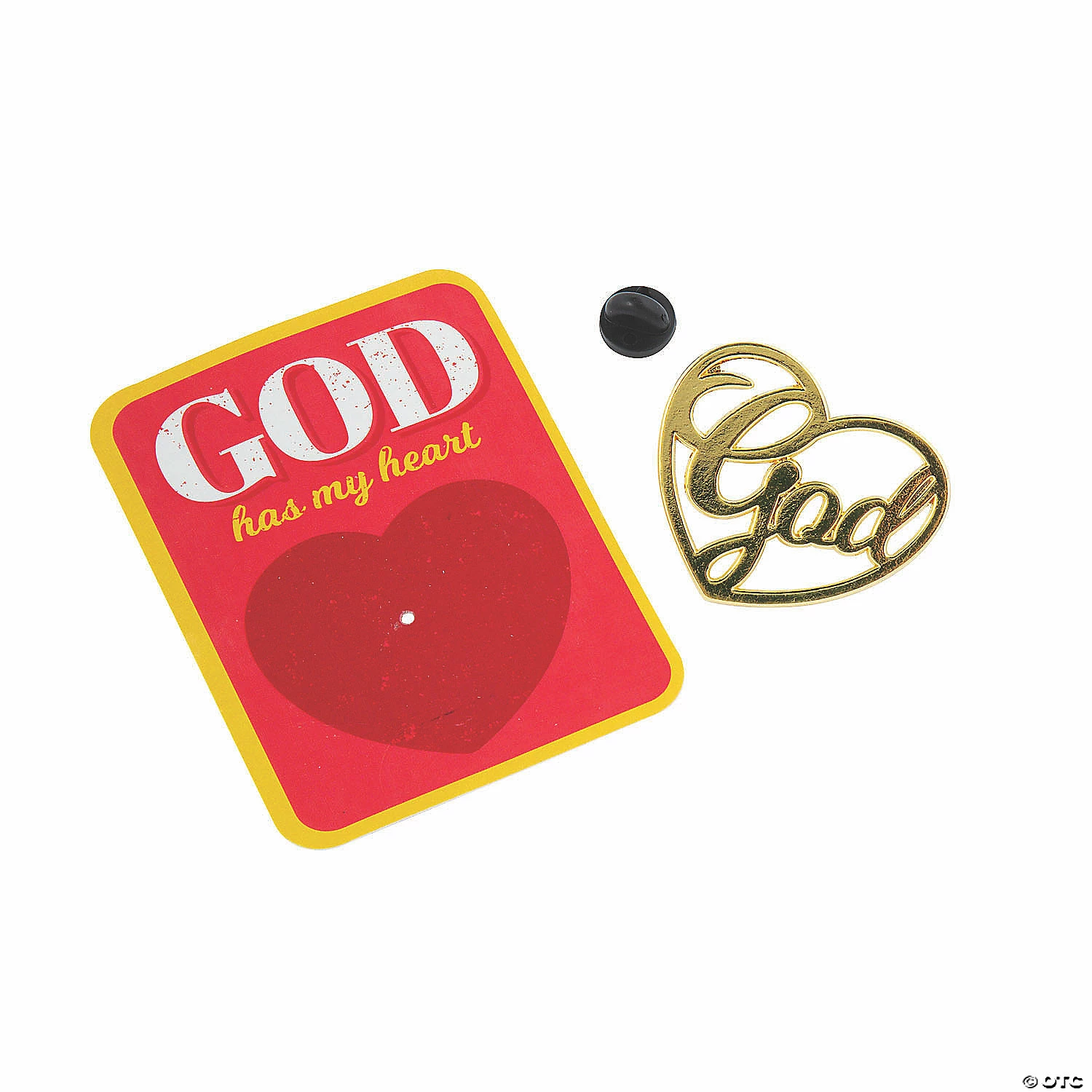 Wear God over your heart with one of these lovely religious pins! Perfect as religious giveaways, these heart-shaped pins have “God” in cutout script inside and come on cards with the words “God has my heart”. Include these giveaway pins in welcome to the church goody bags or hand them out to church-goers. Metal. 2 1/2″ pins on 2 1/4″ x 3″ cardstock cards. © OTC