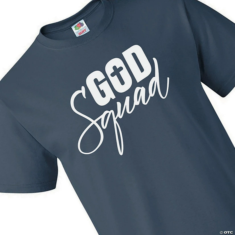 Members only! This religious graphic tee is strictly reserved for members of the God Squad! Wear the inspirational t-shirt to teach Sunday School, to work at a church event or just out and about for a casual look. You can even purchase several of the “God Squad” shirts for your entire bible study crew or volunteer group! © OTC• Fruit of the Loom®• Short sleeve• 50% cotton and 50% poly• Tear away label• Double needle hemmed sleeves and bottom• Need more? With our tees, we’ve got your back (and front)! To order in bulk for any size group, just call 1-877-513-0384. Or, give us a ring if you’d like to easily customize any of our pre-printed shirts with our free design service.