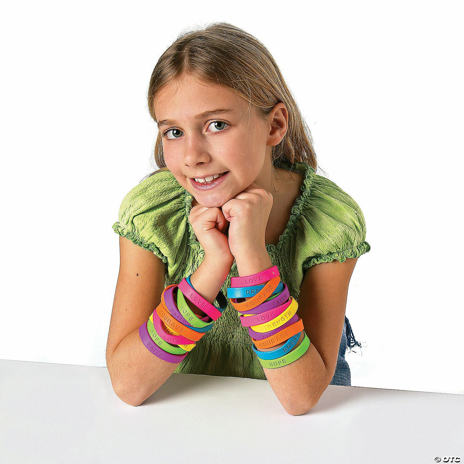 These bracelets have imprinted inspirational messages: “COURAGE”, “DREAM”, “HOPE”, “LOVE”, “FAITH” and “STRENGTH”. Wear one or several on your wrists! This jewelry makes a colorful party favor for goody bags at a church or Sunday School party. Kids love to collect these bracelets and share them with friends! Rubber. (2 dozen per unit) 7 1/4″ circ. © OTC