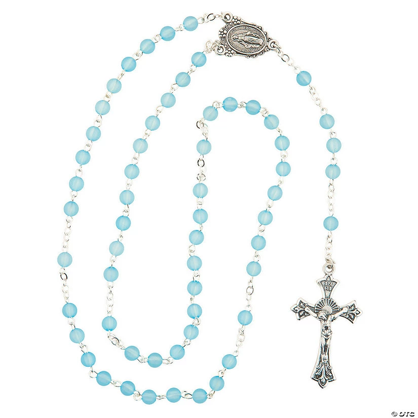 Give this beautiful blue aquamarine rosary to a loved one as a religious gift! Perfect for a baptism, First Communion or March birthday, this baby blue beaded rosary also makes a meaningful boy baby shower present. Take a look at even more religious keepsakes and gifts found elsewhere on this website. Metal. 18 3/4″