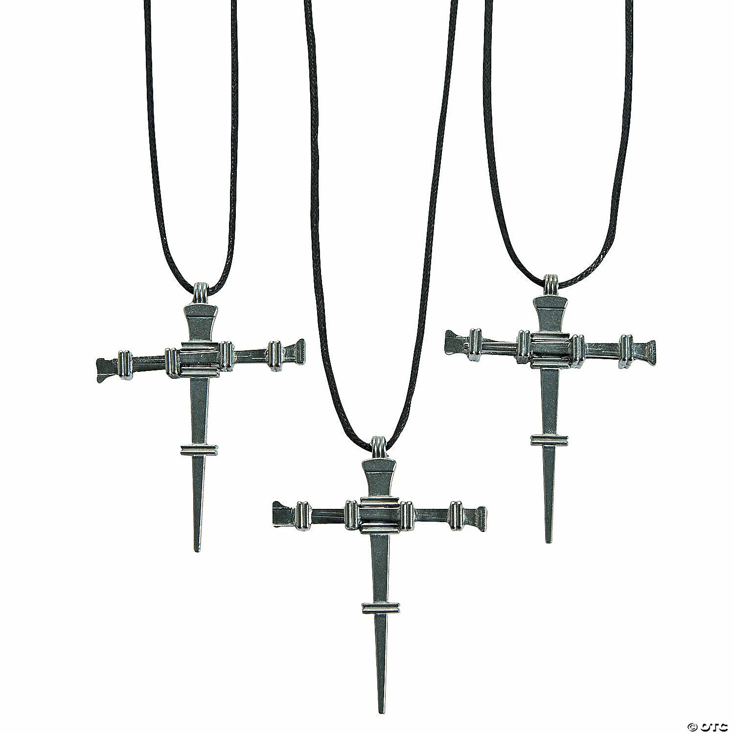Pewtertone Nail Cross Necklaces. These necklaces have crosses made from pewtertone nails! They make great Easter gifts or inspirational gifts for church groups. Each 2″ pewtertone metal cross is on a 24″ black nylon cord with a breakaway clasp. © OTC