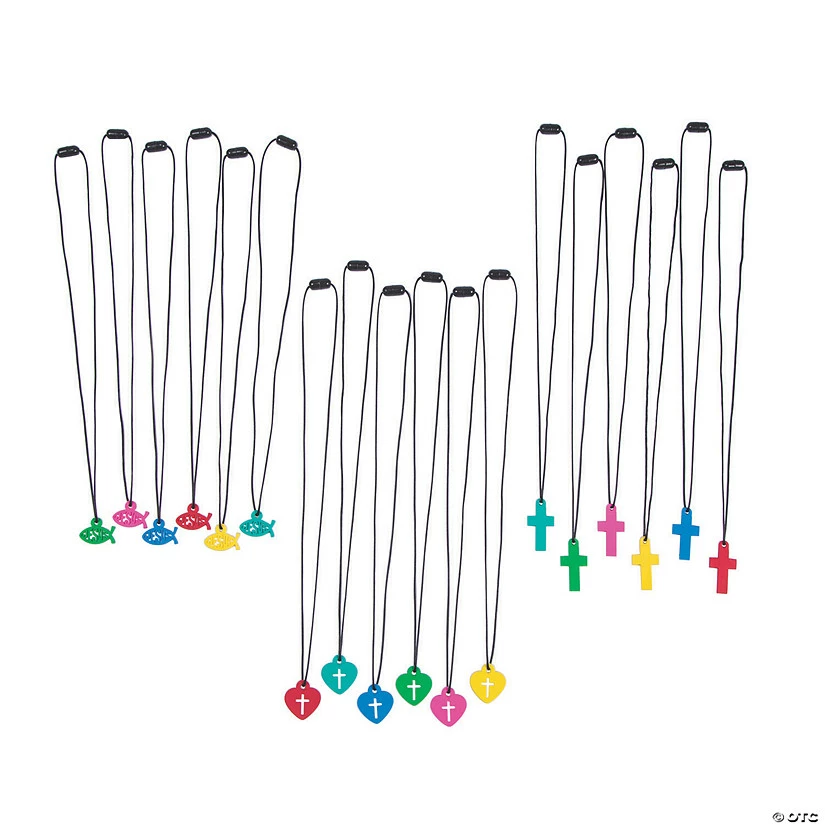 Everyone loves candy, but why not add new and unique Easter egg fillers to the mix? These religious necklaces are the perfect size to fit into plastic eggs, so they’re must-have for church egg hunt supplies! The assortment includes three faith-based designs: a Jesus fish, a heart shape with cross cutout and a cross. Rubber. (144 pcs. per unit) 3/4″ – 1 1/4″ charm on a 24″ satin breakaway cord. Assortment may vary. © OTC