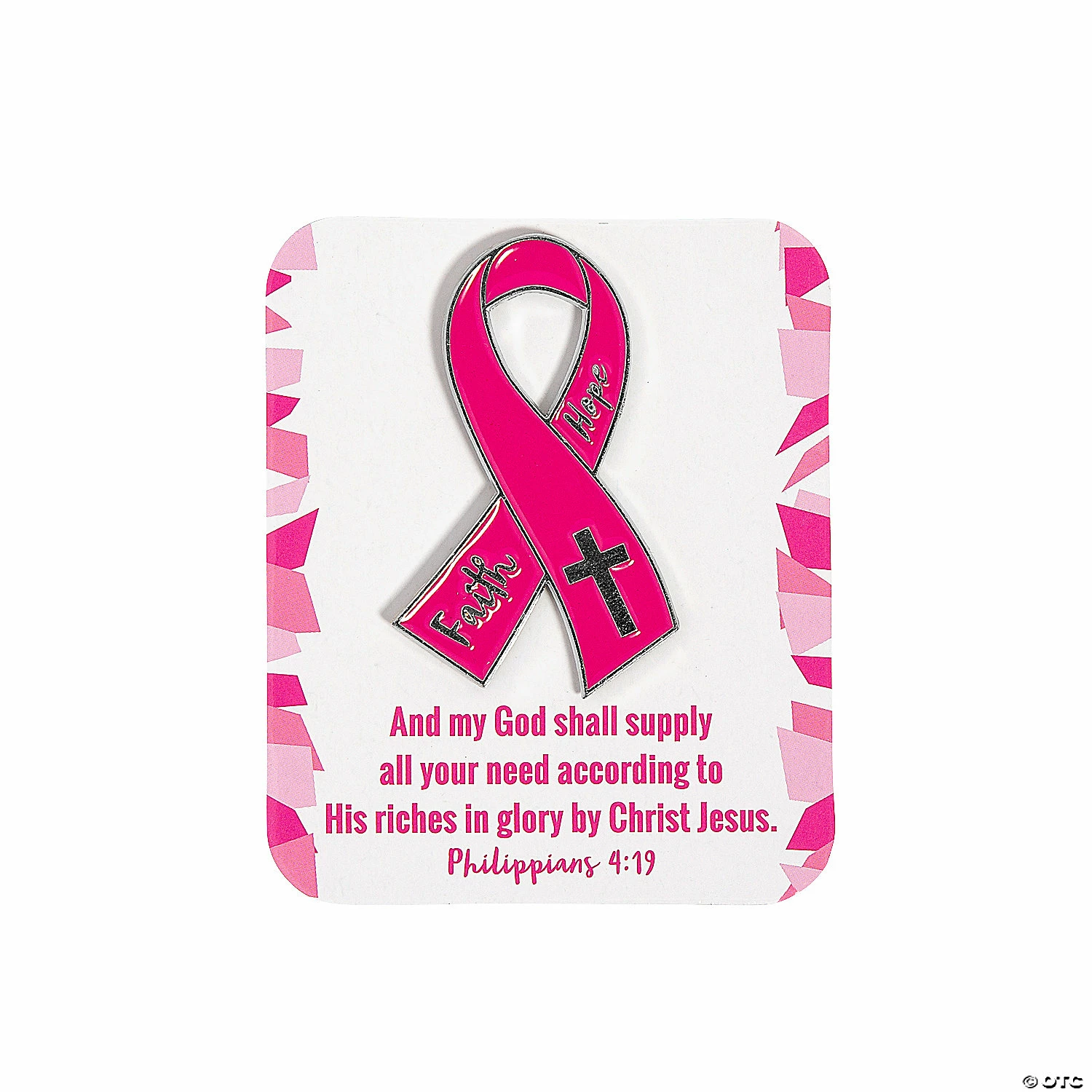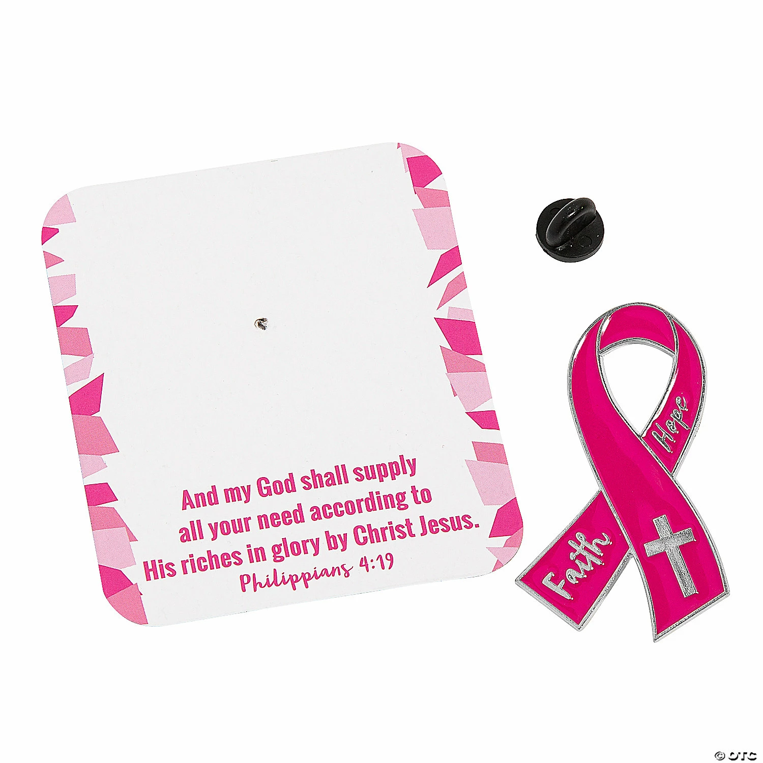 Pin on your support with these pink ribbon accessories! These enamel pins feature a pink ribbon adorned with a cross and the words “Faith” and “Hope” along with a complimentary card that includes an inspiring verse from Philippians 4:19. Gift these to support groups at church or hand them out during a Breast Cancer Awareness event. Cardstock cards, 2 1/2″ x 3″; metal pins, 1 1/4″ x 2″. © OTC