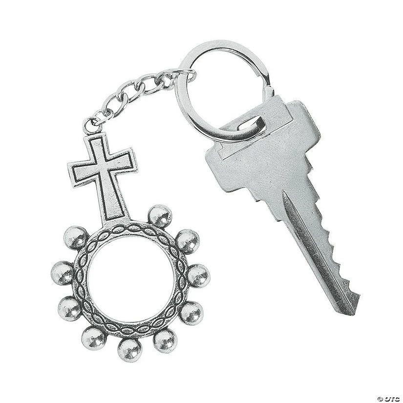 Hand these simple yet powerful Rosary Key Chains out at your church events and gatherings. Great gifts for your fellow parishioners, these silvertone key chains feature a cross and a unique detailed design. Metal. 2 1/2″ on a 1″ metal ring. © OTC