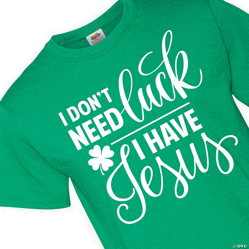 Who needs luck when you have Jesus in your corner? Don this religious St. Patrick’s Day shirt to show off your faith while wearing the obligatory March 17th green clothing. Printed with a fashionable script font and a cute shamrock, you’ll want to wear this comfortable green T-shirt all year long. © OTC• Brand: Fruit of the Loom• Short sleeve• High-density fabric• 50% cotton and 50% poly, 5.0 oz.• Tearaway label• Double needle hemmed sleeves and bottom• Need more? With our tees, we’ve got your back (and front)! To order in bulk for any size group, just call 1-877-513-0384. Or, give us a ring if you’d like to easily customize any of our pre-printed shirts with our free design service.