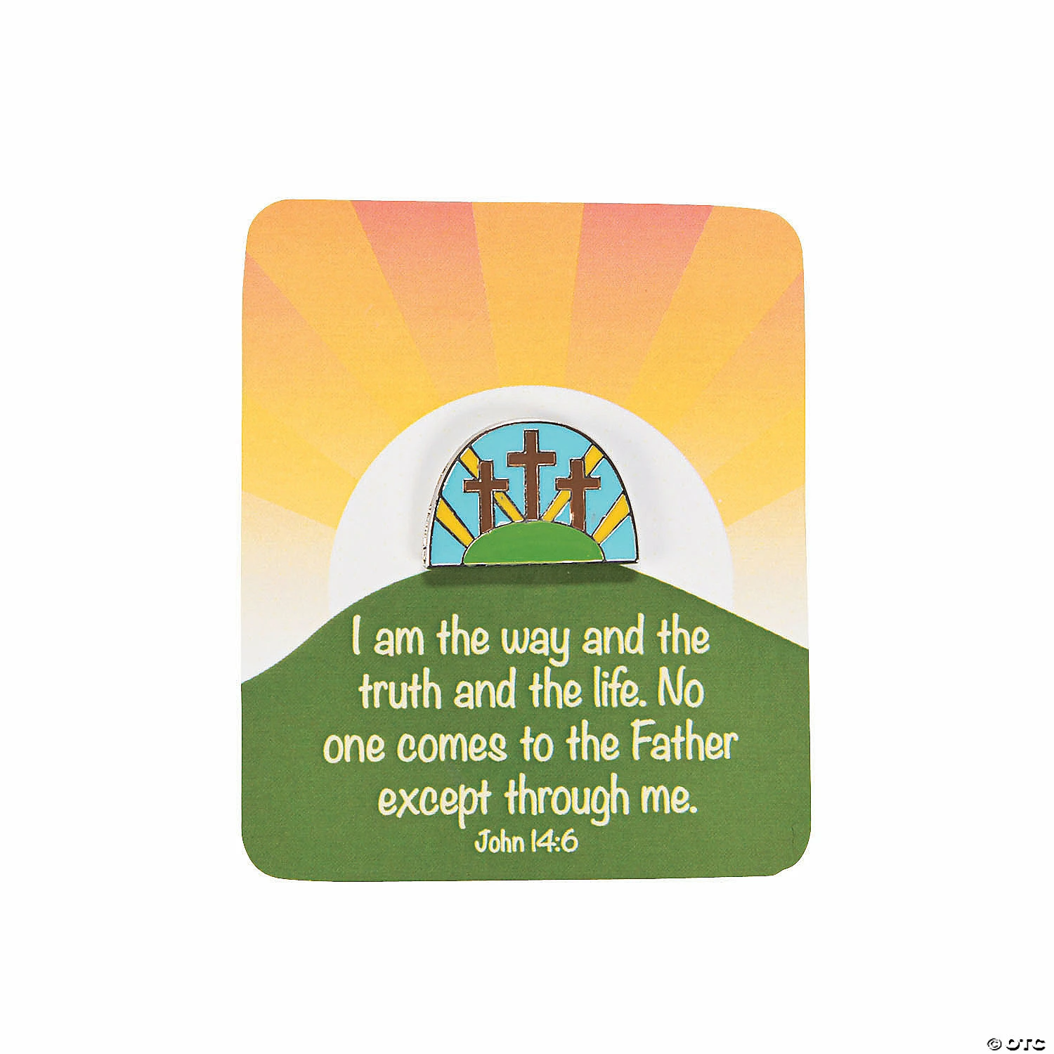 The perfect way to pay respect to Jesus’ sacrifice! A meaningful addition to Easter handouts, these religious pins feature the three crosses and come on a card that displays a hopeful and bright sunset. Churches can hand these out to every attendee during a Good Friday or Easter Sunday service, or they can be hidden in plastic Easter eggs during a community hunt. Each 3/4″ metal pin comes on a 2 1/4″ x 2 3/4″ paper card. (3 dozen per unit) © OTC