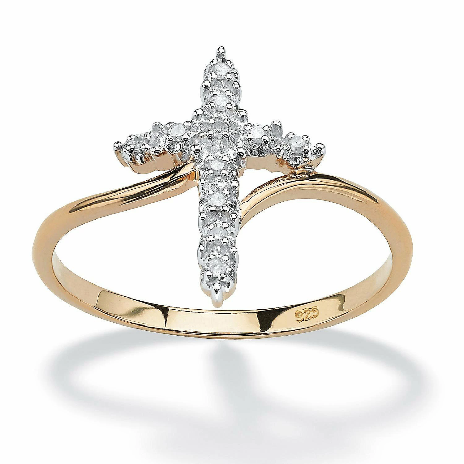 The brilliant sparkle of diamond accents updates this traditional cross ring, giving it a fashion-forward look. An elegant expression of your faith rendered in 18k gold-plated sterling silver. Sizes 5-10.