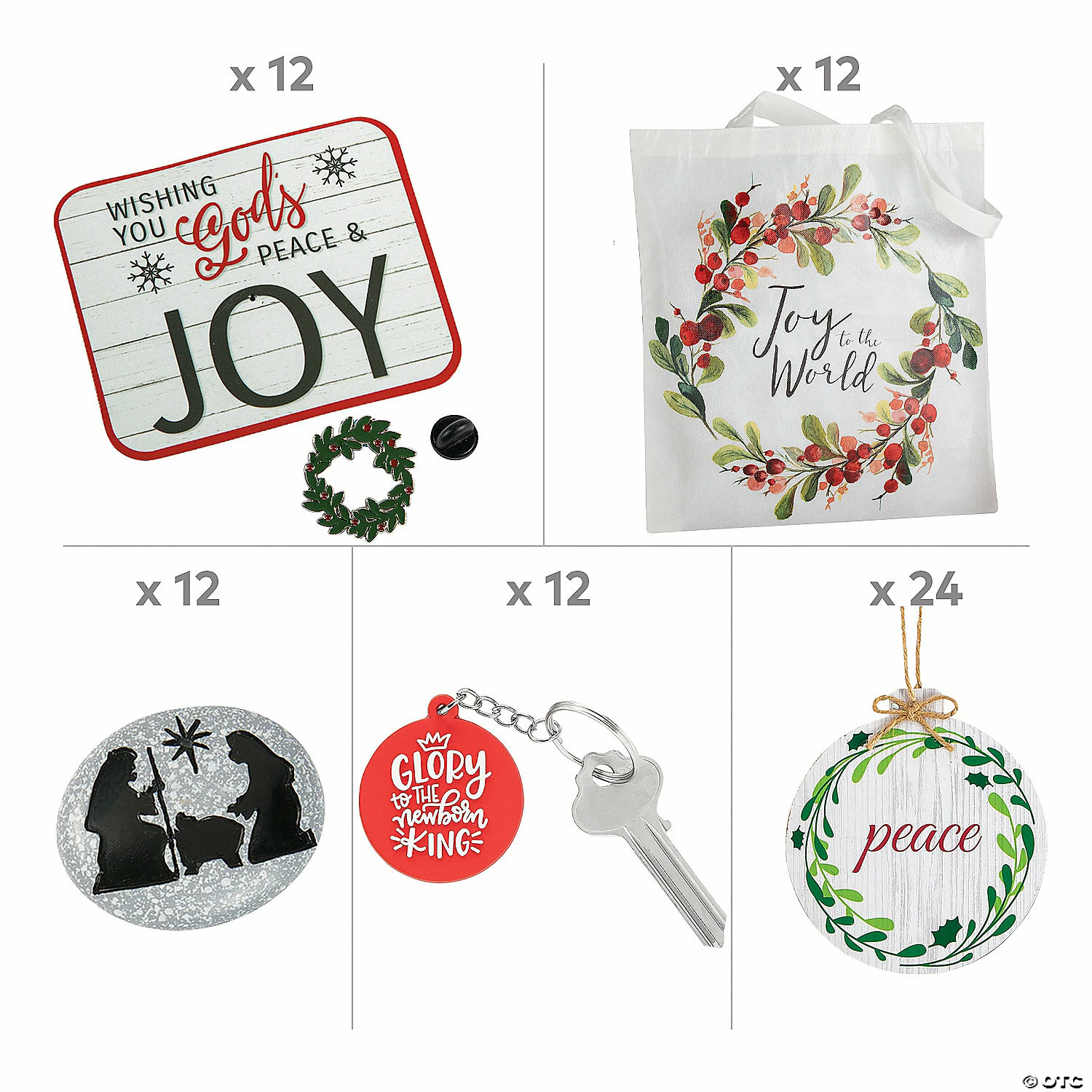Pull together some lovely gift bags for Bible Study ladies or to thank church volunteers for their work throughout the year with the help of this kit. Filled with ornaments, pins and other religious items along with gift bags with faith messaging, this kit makes it easier than ever to put together gift bags for your sisters in Christ. (72 pcs. per unit) Simple assembly required. Assortment may vary.Includes:• 12 Rubber Christmas Keychains (1 1/2″ x 1 1/2″ on a 1″ metal ring.)• 24 Wood Berry Wreath Round Ornaments with Inspirational Messages (3 3/4″ x 4″)• 12 Metal Joy Faith Wreath Pins with Card (1 1/4″ with 3″ x 2 1/2″ cardstock card.)• 12 Nonwoven polypropylene Large Joy to the World Laminated Tote Bags (15″ x 17″ with 11 1/2″ handles. • 12 Resin Nativity Stones (2″ x 1 1/2″)